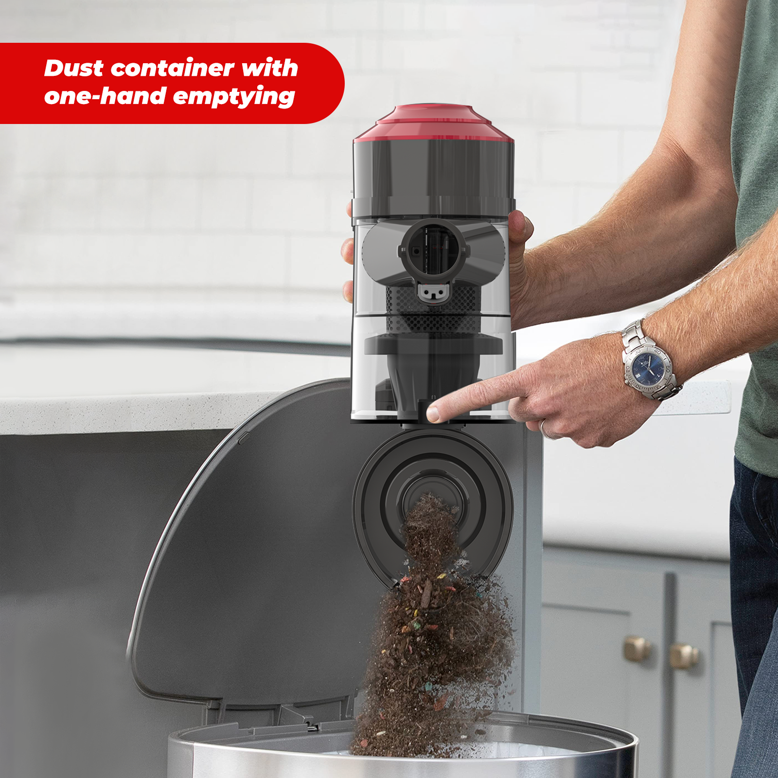 Emptying the dustbin is easy with one-click release. The washable HEPA filter can be rinsed and air-dried for 24 hours. The tangle-free brush needs little care, but if needed, the roller can be removed from the powerhead for thorough cleaning.