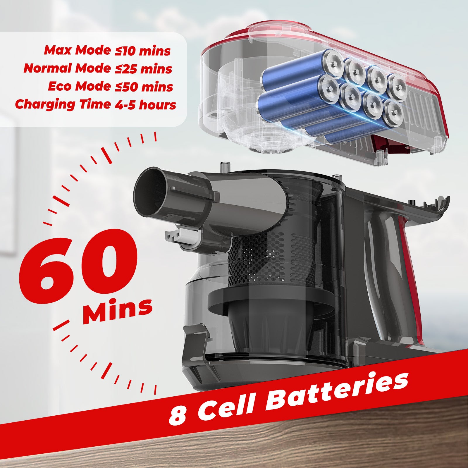 - Powered by Built in 8-Cell lithium battery, this device runs up to 60 minutes in ECO mode, 25 minutes in Normal mode, and 10 minutes in Max mode. Fully charges in just 4–5 hours—perfect for efficient whole-home cleaning.