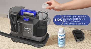 For best results, use Akitas low-foam carpet or upholstery cleaning solution. A complimentary 115ml bottle of Akitas Low Foam Detergent is included in the box. Avoid high-foam cleaners, as they may damage the motor or clog the system.