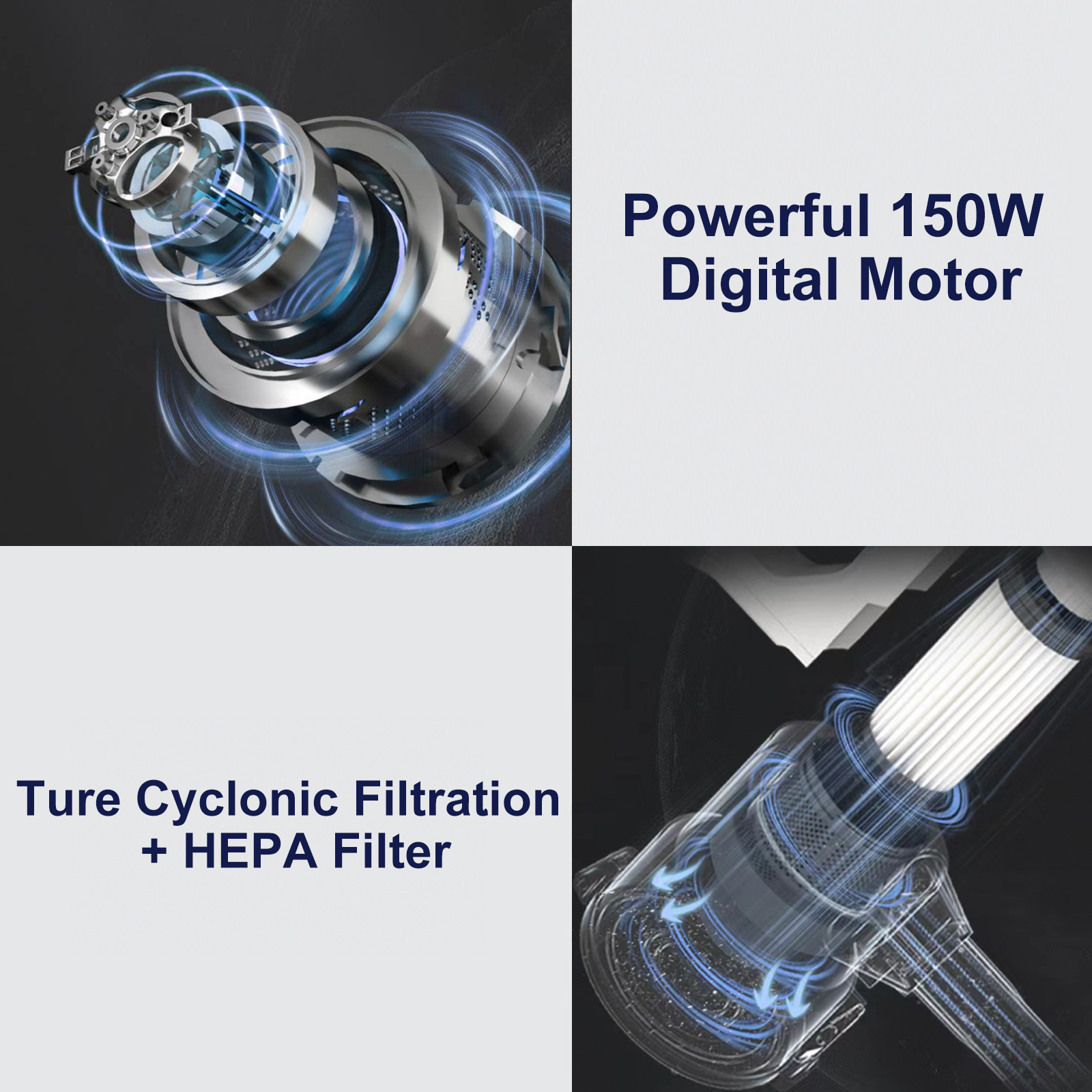 Equipped with a robust 150W digital motor, the Akitas V8 vacuum cleaner effortlessly tackles dust, debris, and pet hair, while its True Cyclonic Filtration system and HEPA filter ensure that 99.9% of dust is captured.